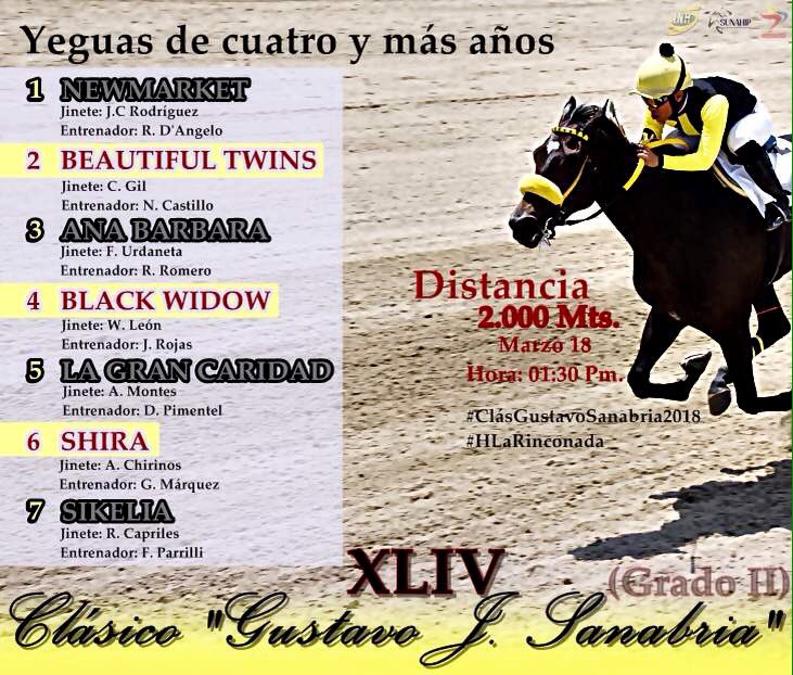 Yeguas de cuatro y más años serán las protagonistas en el Clásico "Gustavo J. Sanabria" para la distancia de 2.000 metros este domingo en La Rinconada. #ClásGustavoSanabria2018
